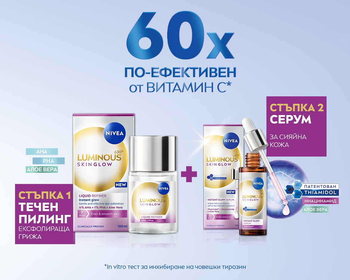 Открий как иновативната формула с Thiamidol® помага за ефективното намаляване на пигментните петна и връща естествения блясък на кожата. Научи как лесно да включиш серията NIVEA LUMINOUS630® в своята ежедневна рутина за сияен, свеж и равномерен тен всеки ден.