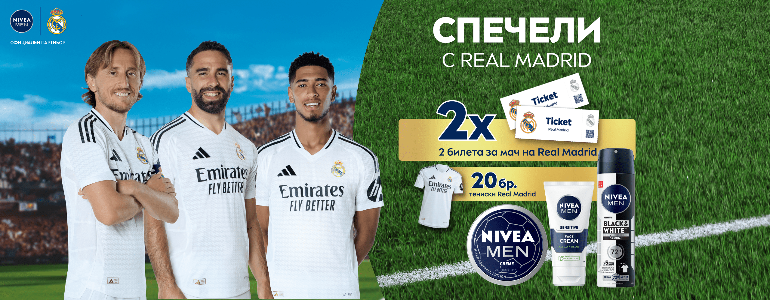 Ако си отдаден фен на Real Madrid, значи си на правилното място, за да изглеждаш и да се чувстваш по най-добрия начин! С NIVEA MEN кожата ти винаги ще бъде в отлична форма - готова за победа, точно като любимия ти отбор. А сега можеш да спечелиш и вълнуващи награди в новата ни кампания – 2х 2 билета за мач на Real Madrid или 20х тениски Real Madrid! Оле! Провери детайлите за участие по-долу и се запиши, за да спечелиш!