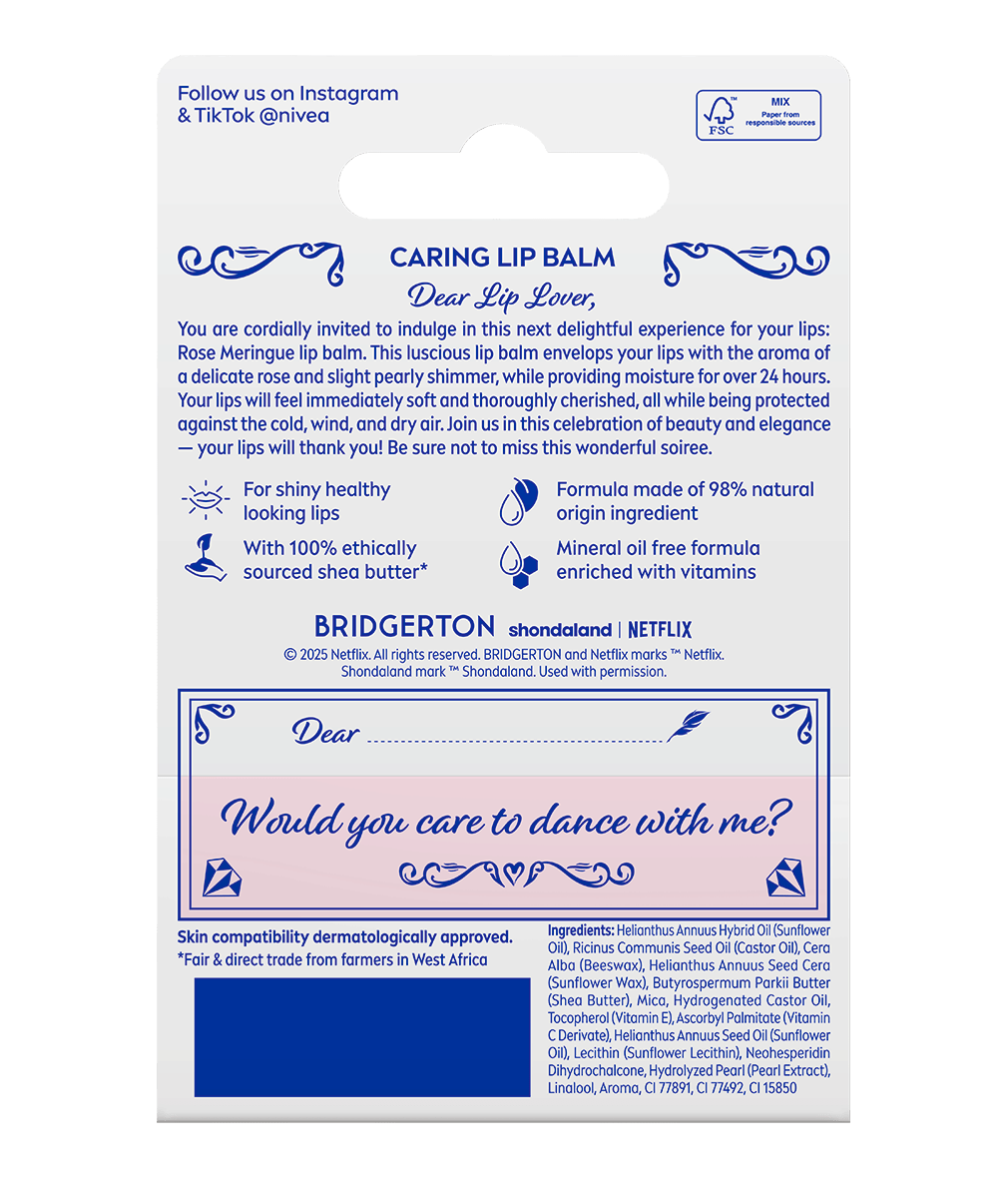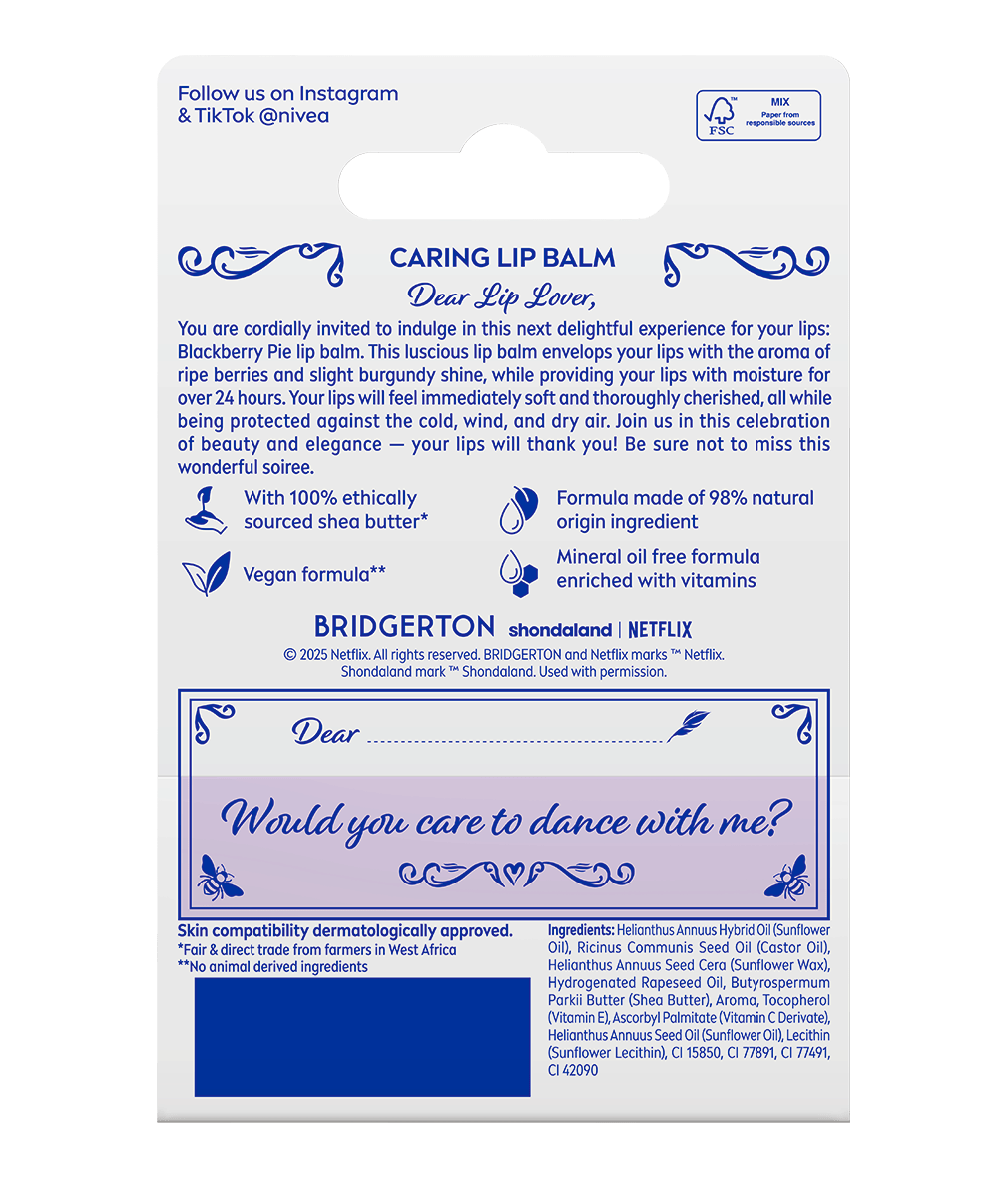 NIVEA се грижи както за устните ти, така и за планетата. Продуктът е клинично тестван, без минерални масла и с дерматологично потвърдена съвместимост с кожата. Вече повече от 110 години NIVEA помага на хората да имат красиви, здрави устни – защото знае, че и те заслужават специална грижа и нежност.