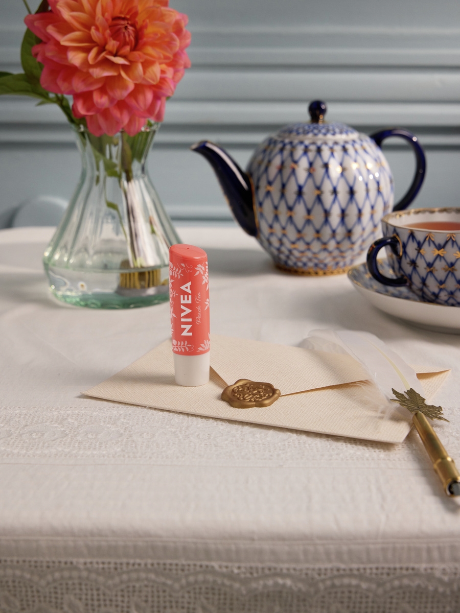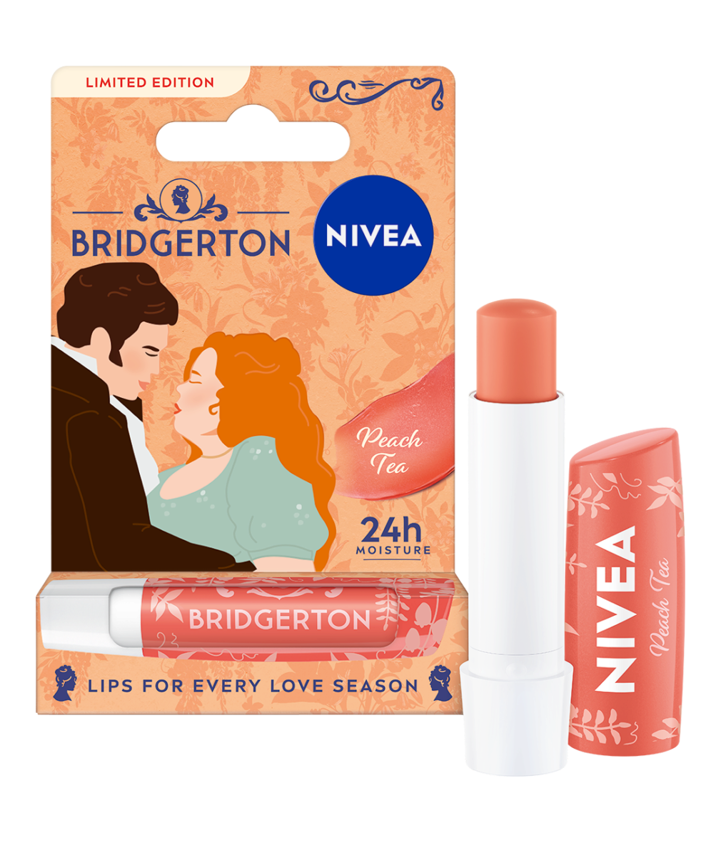 Лимитирана серия NIVEA x Bridgerton: Балсамът за устни Peach Tea хидратира устните за до 24 часа, ухае на сочна праскова и придава нежен коралов блясък.