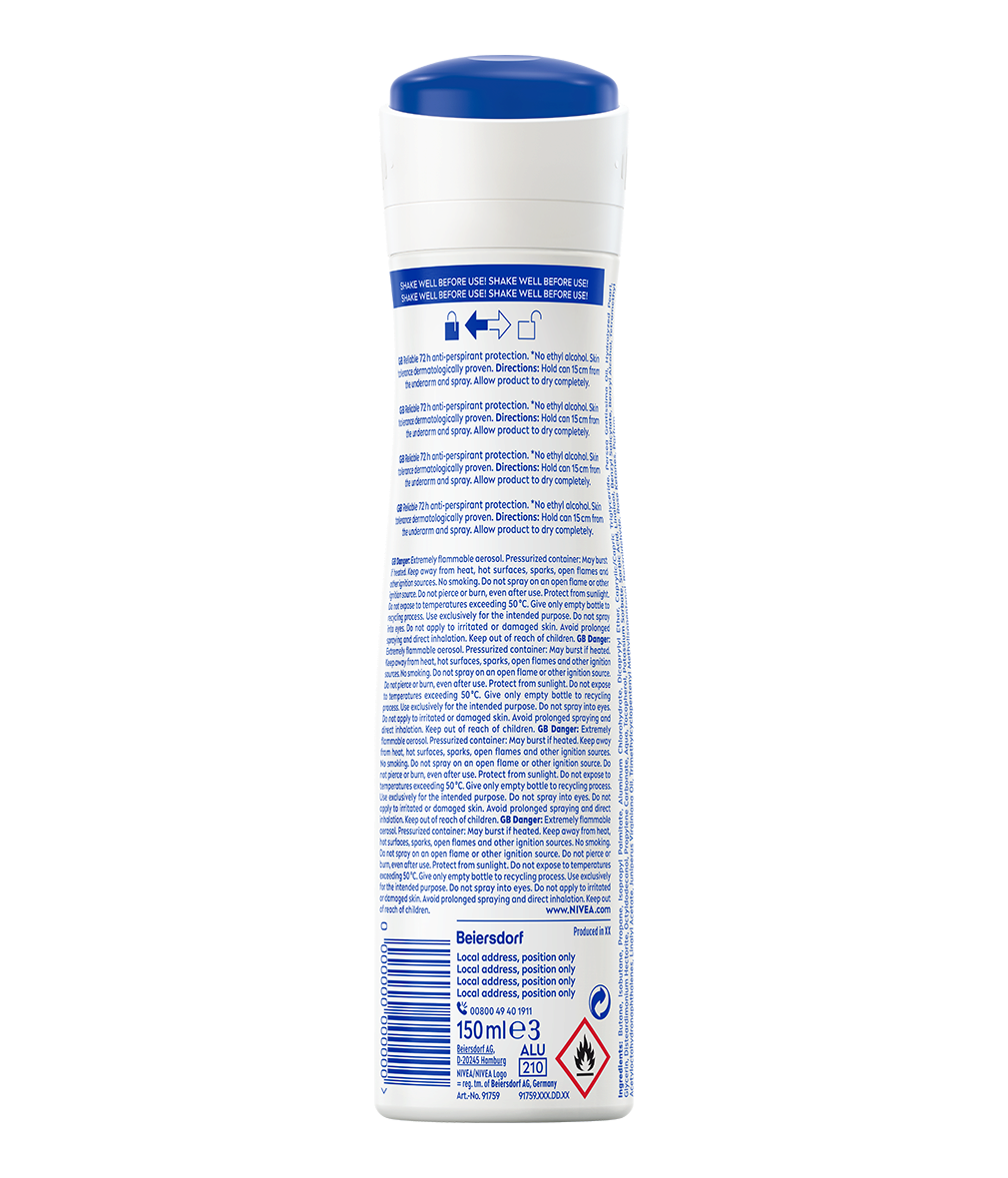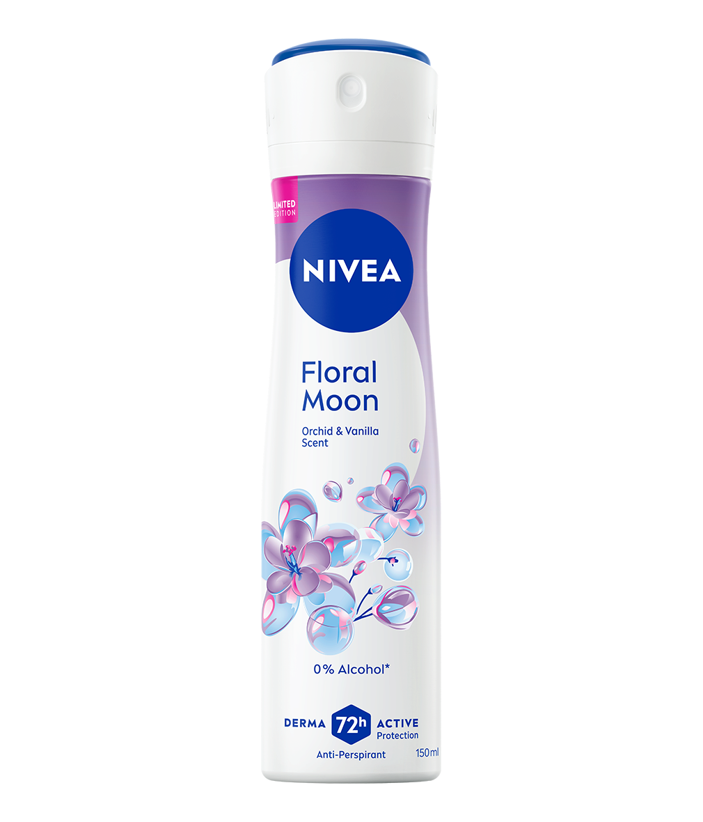 Дезодорант спрей NIVEA Floral Moon осигурява 72-часова защита с аромат на орхидея и ванилия. Формула с 0% алкохол и с дерматологично доказана съвместимост за меки и гладки подмишници.