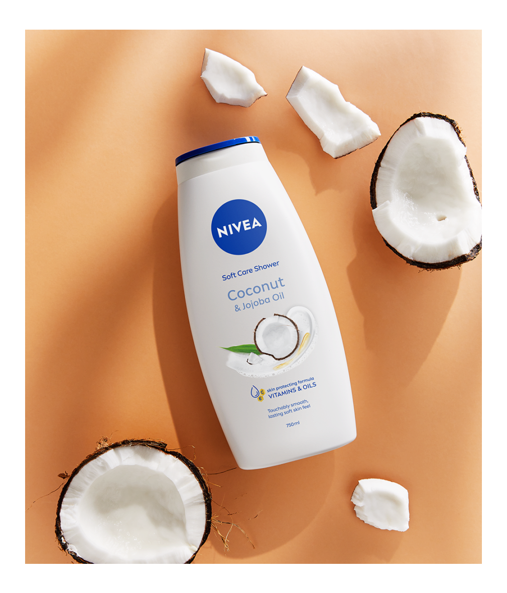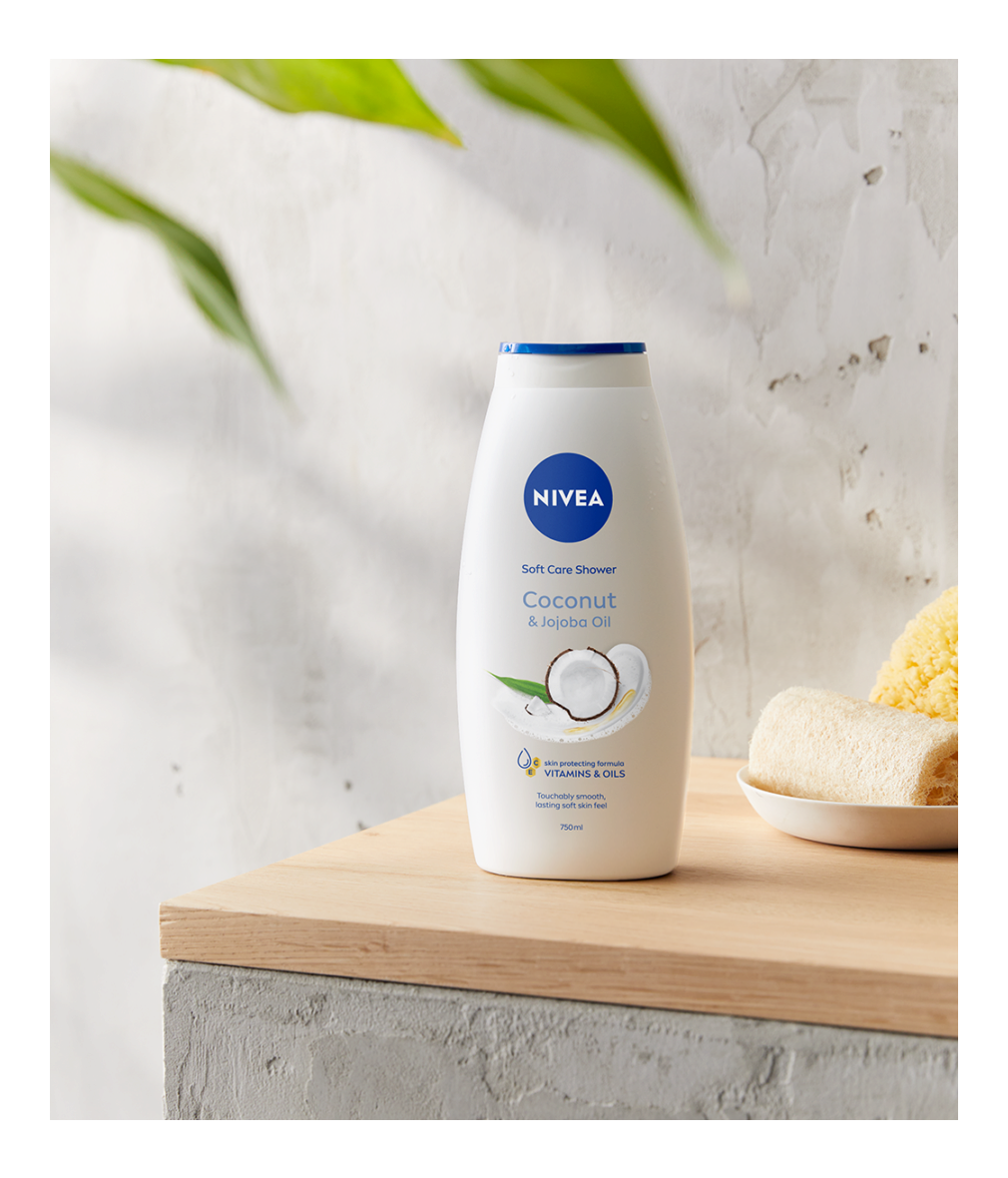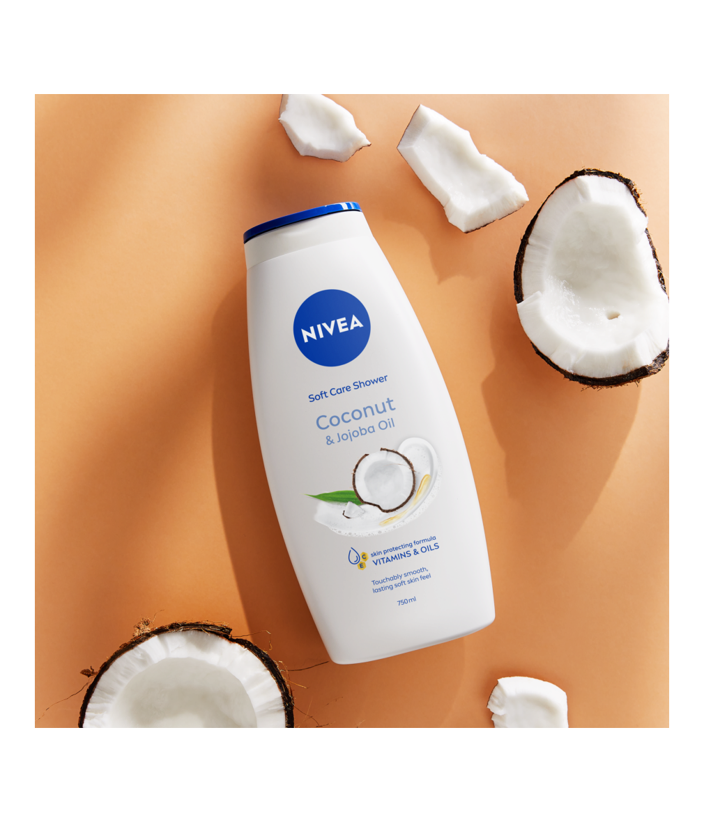 NIVEA Coconut & Jojoba Oil грижовен душ гел с масло от жожоба и аромат на кокосова вода за осезаемо гладка кожа и дълготрайно усещане за мекота. С формула с витамин С, витамин Е и ценни масла за защита на кожата от изсушаване.