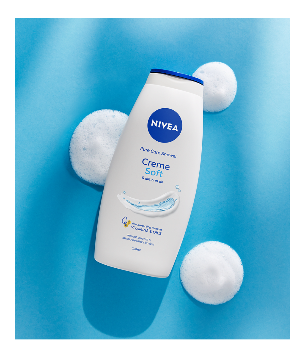 NIVEA Creme Soft: Грижовен душ гел с деликатен и мек аромат, ти дава чувство за мека и здрава кожа. Формулата му обогатена с витамини C, E, ценни масла и бадемово масло нежно почиства и защитава кожата от изсушаване.
