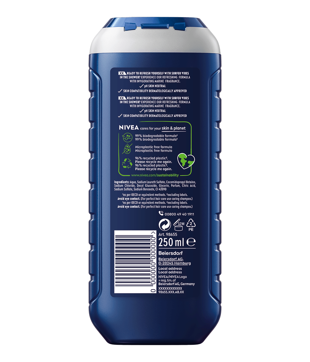 Душ гел NIVEA MEN Cool Marine осигурява енергизиращ морски аромат, перфектен за тяло, лице и коса. Формулата от 250 мл осигурява освежаващо душ изживяване, което енергизира деня ти с усещане за сърфистки вибрации. Дерматологично одобрен, pH неутрален и без микропластмаса, този екологичен продукт има 99% биоразградима формула и опаковка от 96% рециклирана пластмаса. За цялостна грижа комбинирай с подхранващ шампоан за перфектна коса.