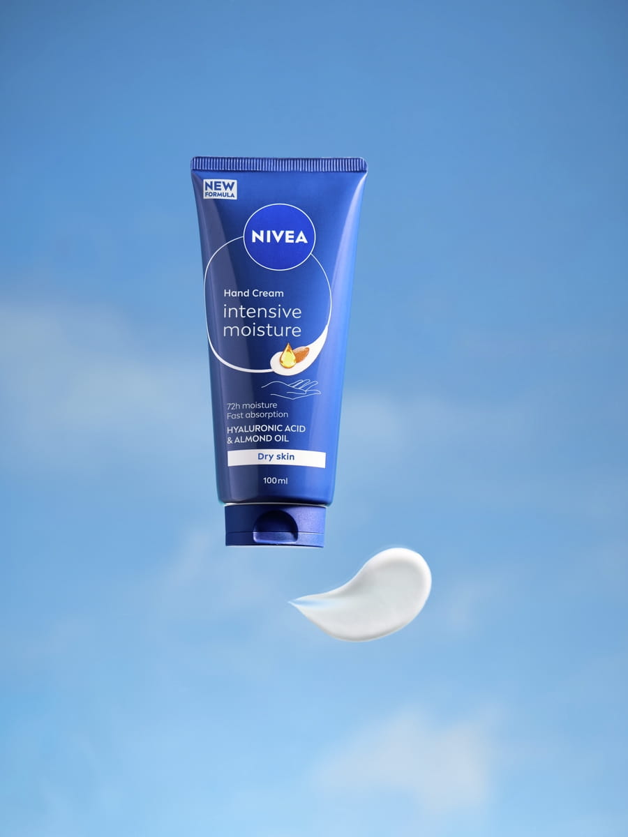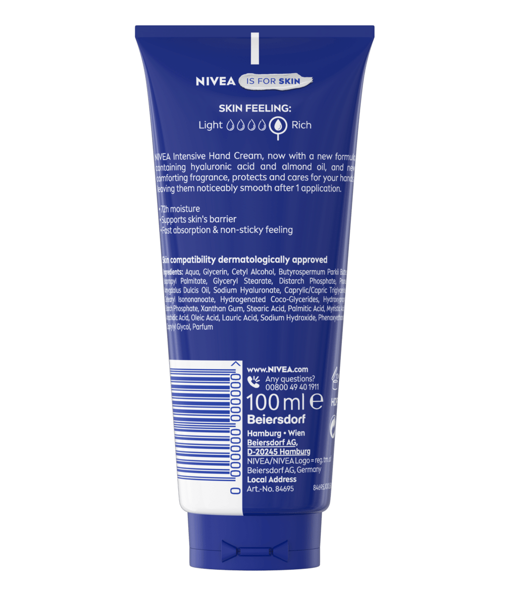 Крем за ръце NIVEA Intensive Care с хиалуронова киселина и бадемово масло - осигурява 72 ч. хидратация и бърза абсорбция за осезаемо меки и гладки ръце.