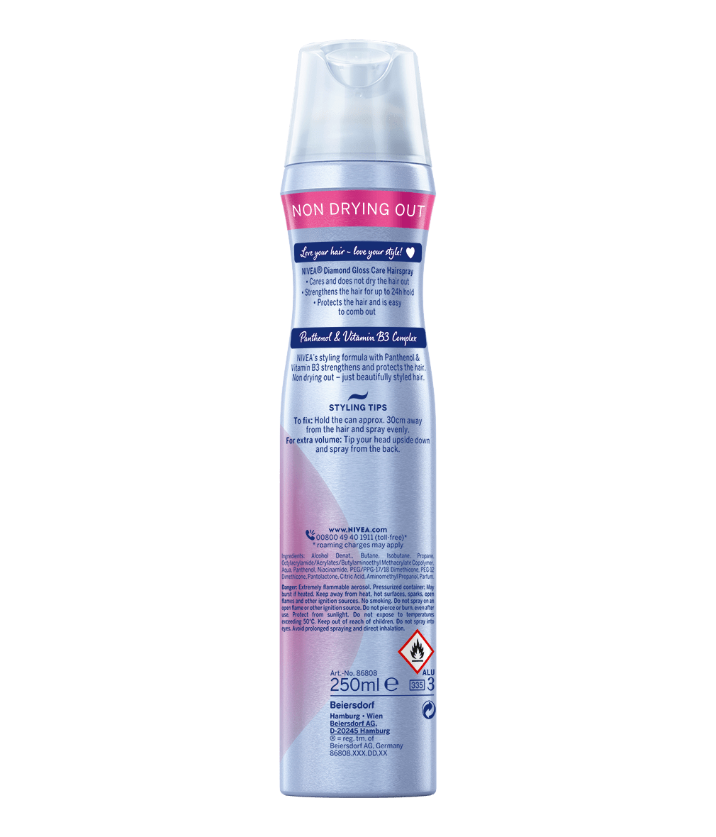Лак за коса, който подхранва, заздравява и защитава косата. За 24 часова фиксация и неустоим диамантен блясък: Лак за коса NIVEA Diamond Gloss Care
