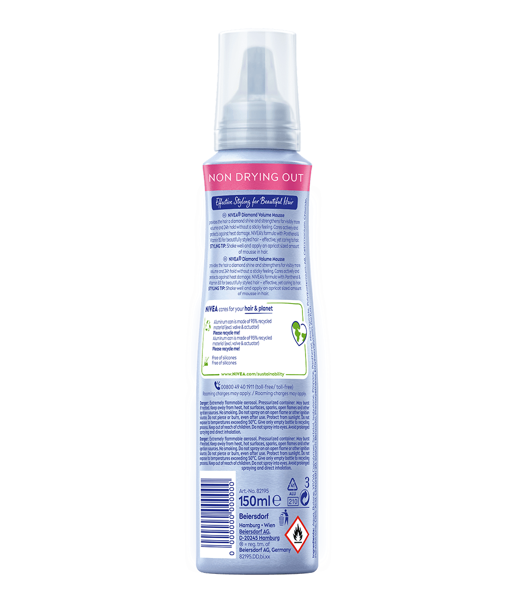Съдържа: Aqua, Isobutane, VP/VA Copolymer, Sorbitol, Propane, Panthenol, Niacinamide, Polyquaternium-68, Butane, Pantolactone, Cetrimonium Chloride, PEG-40 Hydrogenated Castor Oil, Citric Acid, Sodium Benzoate, Phenoxyethanol, Ethylhexylglycerin, Parfum
